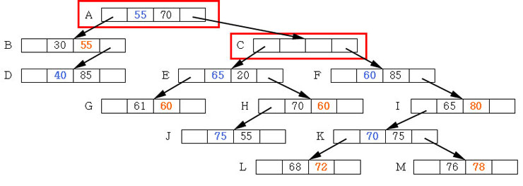 y값 20이 B의 y값 70보다 작으므로 B의 왼쪽 자식이 된다
