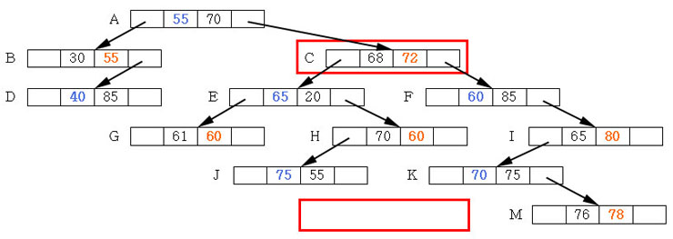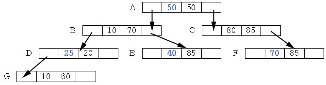 5. E(40, 85)는 x값 40의 루트의 x값 50보다 작고, y보다 85가 B의 y값 70보다 크므로 B의 오른쪽 자식이 된다