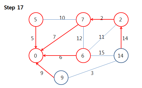 Step 9부터는 key 값이 5인 정점에 대해 Step 4 ~ Step 7의 과정을 수행할 것입니다.