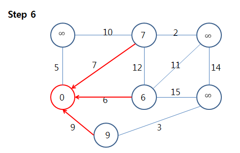 Step 4에서 가중치 값 = 6 < inf = key 값